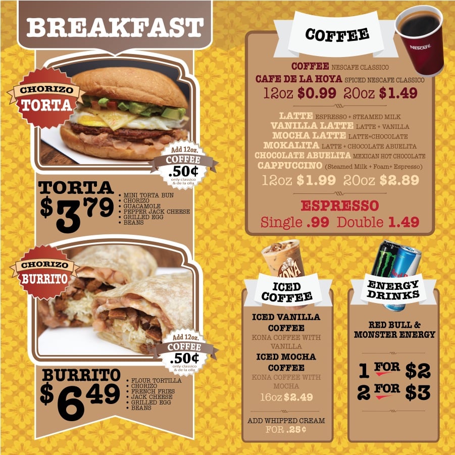 A mini telera roll filled with your choice of meat, grilled egg, beans, mayo, guacamole, pepper jack cheese, salsa, onions and cilantro.